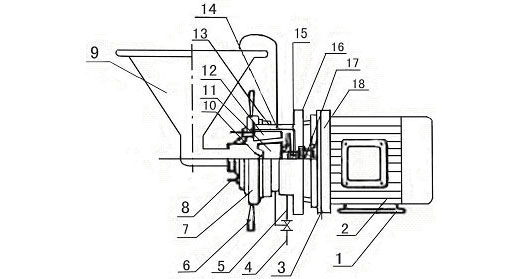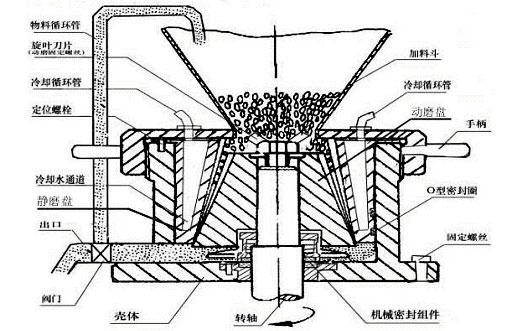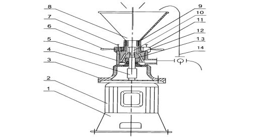 9.進料通道 10.旋葉刀 11.調(diào)節(jié)盤 12.靜磨盤 13.動磨盤 14.循環(huán)管