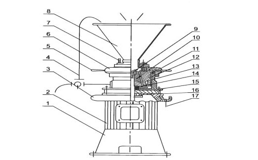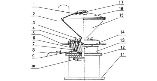 9.手柄10.壓蓋 11.活接 12.加料斗 13.旋葉刀 14.動磨盤 15.靜磨盤 16.調(diào)節(jié)盤