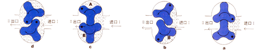 昊星ZB系列膠體泵-又稱羅茨泵、不銹鋼轉(zhuǎn)子泵、凸輪泵、萬用輸送泵、酵母泵、蝴蝶泵、三葉泵、鞋底泵、藥料泵、熱溶膠體泵、顆粒膠體泵、渣料泵、蛋白渣泵、高濃漿泵等,依靠兩個(gè)同步反轉(zhuǎn)動(dòng)的轉(zhuǎn)子在旋轉(zhuǎn)過程中于進(jìn)口處產(chǎn)生吸力(真空度),從而吸入所要輸送的物料。兩轉(zhuǎn)子將轉(zhuǎn)子室分隔幾個(gè)小空間,并按a b c d 的次序運(yùn)轉(zhuǎn);運(yùn)轉(zhuǎn)至位置a 時(shí),只有 I 室中充滿介質(zhì);到位置 b 時(shí),B室中封閉了部分介質(zhì);到位置c 時(shí),A 室中也封閉了部分介質(zhì);到位置 d 時(shí),A、B 室與 II 室相通,介質(zhì)既被輸送至出料口。