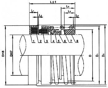 1、靜環(huán)墊 2、靜環(huán) 3、動環(huán) 4、波紋管 5、傳動套 6、緊圈 7、彈簧 8、彈簧座